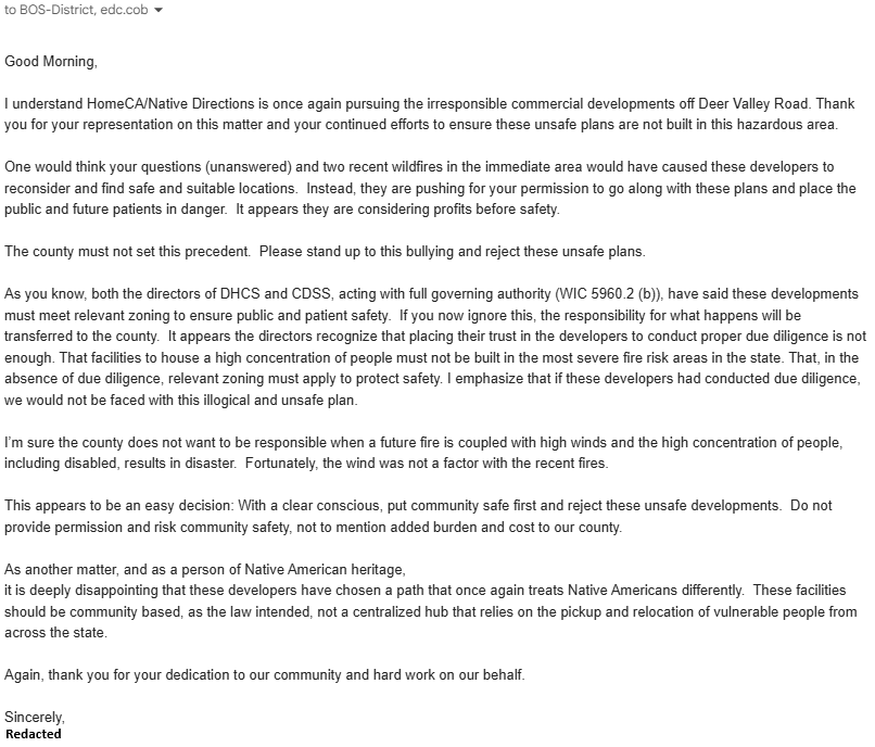 A few of our community members have sent in strong emails requesting the El Dorado County Board of Supervisors to reject these projects in the face of this legal threat from the developer. I want to highlight one in particular below. This email summarizes well the numerous points we have made over the last 24 months to our county officials. I want to encourage you to take a few moments and ensure your voice isheard.