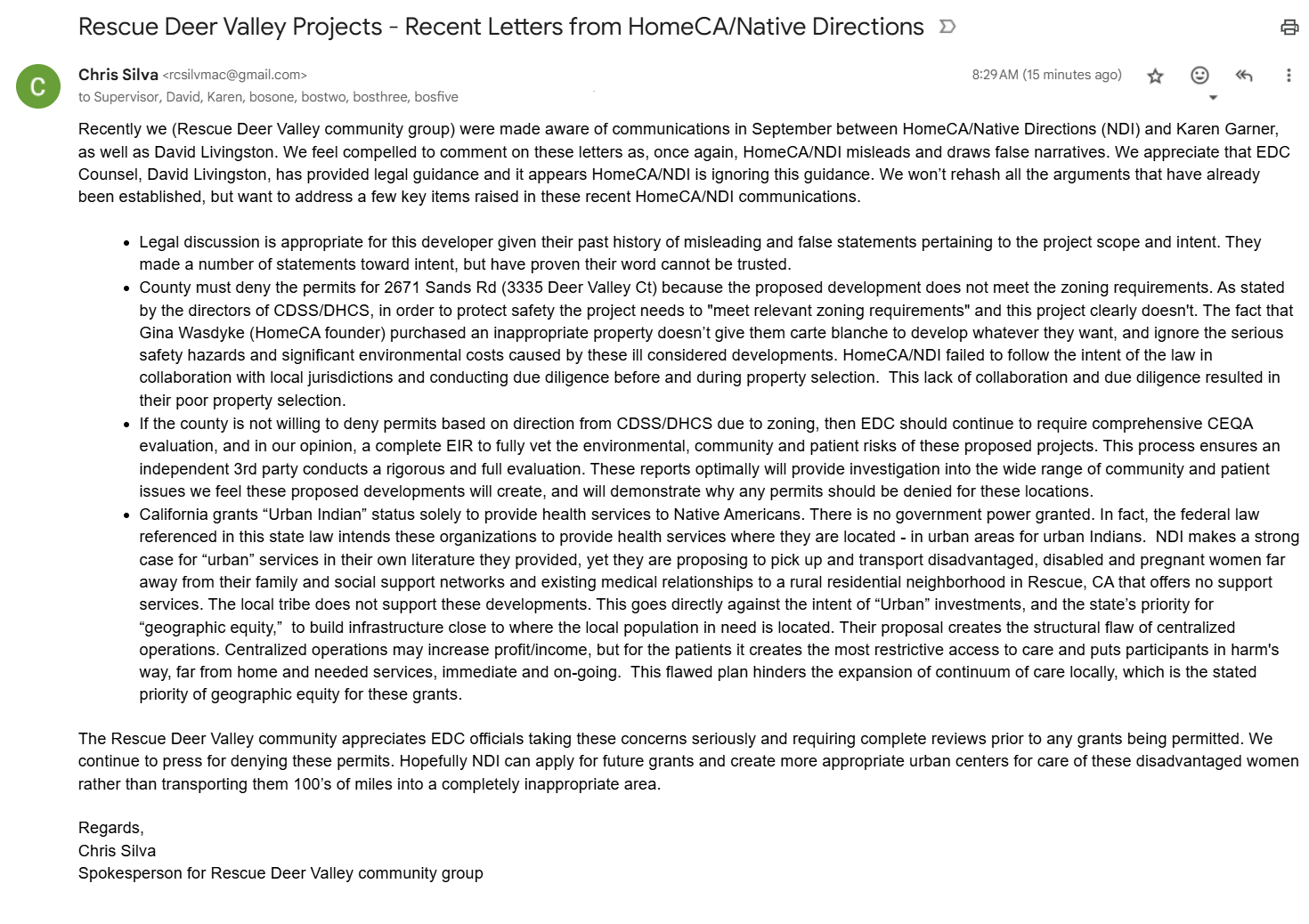 - March 29 – HomeCA/Native Directions requests a letter of support from El Dorado County, which Supervisor Parlin declines. This request, along with Supervisor Parlin’s response, and Chris Silva initial response, is located here.