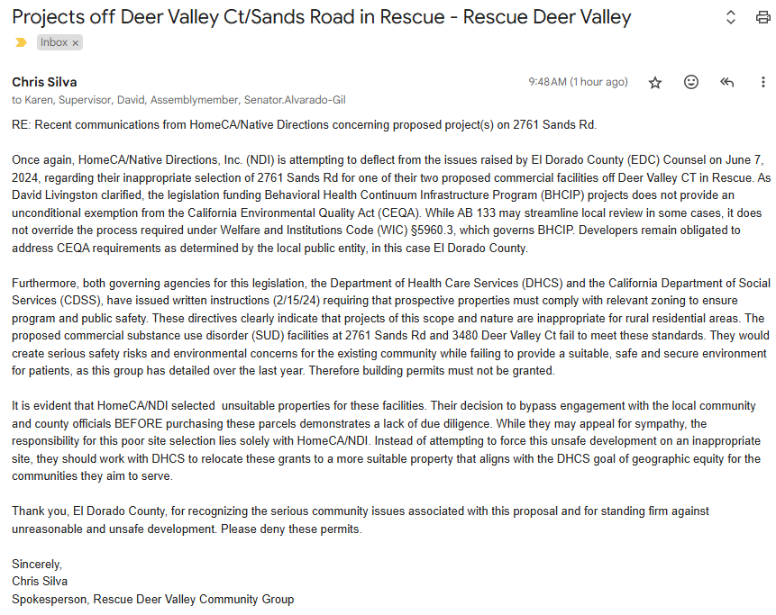 - March 20 – DHCS/DSS Letter of response (link) to Senator Alvarado-Gil copy delivered to Rescue Deer Valley per Freedom of Information Act request (here) stating “for BHCIP and CCE projects to progress, awardees are required to work within their local jurisdiction to obtain necessary permits through local Planning and Building Departments and meet relevant zoning requirements to ensure programmatic and local requirements are met.“
