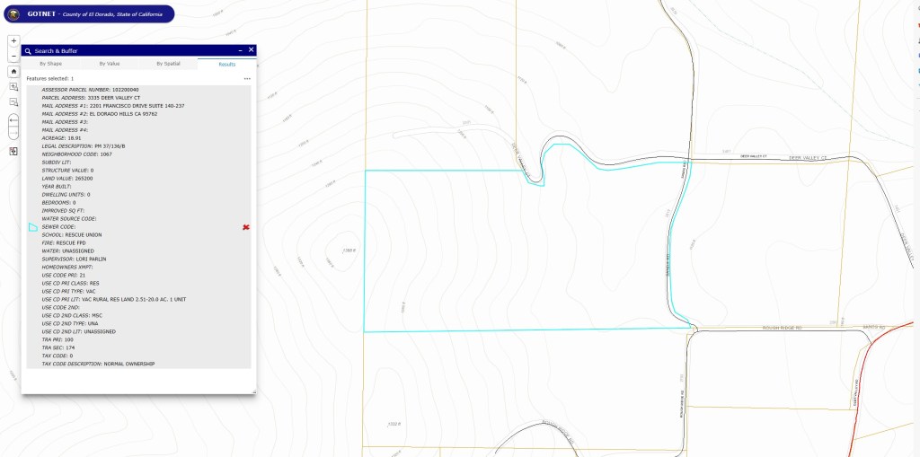 This 19-acre parcel is inset from Deer Valley Road one block. It is designated as RL-10 (Rural Land). The “main” street access to this parcel is Sands Road, which is unpaved. The parcel has a sharp rise in terrain, and only the lower, eastern, section of the parcel can be developed. It is estimated that ~7-acres of this parcel can be developed. The other portion of the parcel is significantly rocky, and steeply rising terrain. The lower portion of this parcel provides significant water runoff from the hill to the west side of the property, where the water flows north into Martel Creek, which ultimately feeds the South Fork of the American River. El Dorado Water District pulls water directly downstream from this run off to serve El Dorado Hills water needs.